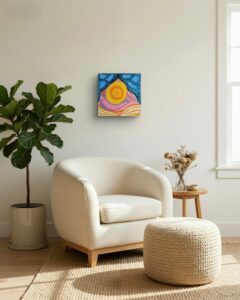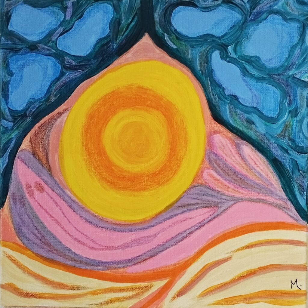 Peinture symbolique contemporaine – tableau spirituel lumineux – art contemporain français – peinture soleil abstrait – œuvre originale acrylique sur toile 30×30 cm – tableau énergie positive – art mural lumineux – artiste peintre française – œuvre unique faite main – décoration intérieure chaleureuse.