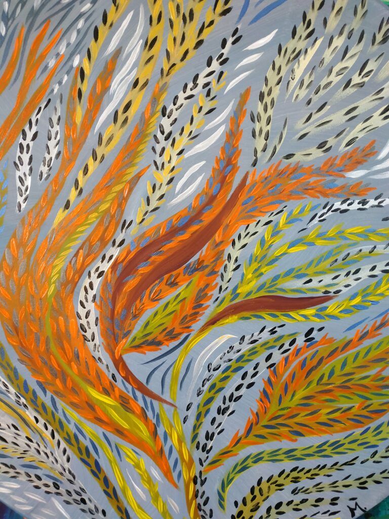 Des formes organiques, curvilignes, comme un enchevêtrement de plantes, de racines, de fleurs imaginaires — un jardin intérieur, foisonnant, vivant, luxuriant. Les teintes vives et contrastées s’entremêlent, les lignes ondulent, s’accrochent, se libèrent, créant un espace foisonnant et plein de surprises. Le regard voyage, découvrant des chemins invisibles, des volutes végétales, des respirs de feuillages abstraits, comme un rêve de nature intérieure.