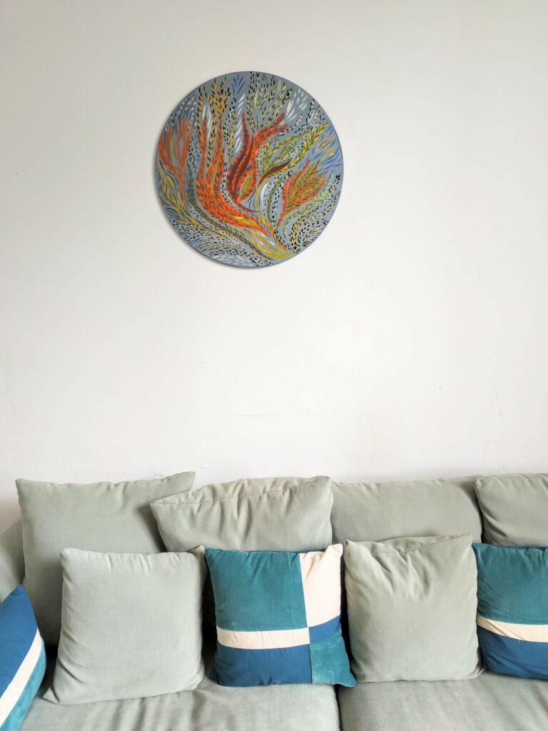 Accrochée, l’œuvre habillera l’espace comme une explosion vitale : elle apportera mouvement, énergie, respiration, couleur. Elle pourra transformer un intérieur en un refuge végétal, un espace de vitalité, d’inspiration, d’ouverture vers l’imaginaire. Elle invite à la contemplation, au voyage intérieur, à la douceur et à l’éveil.