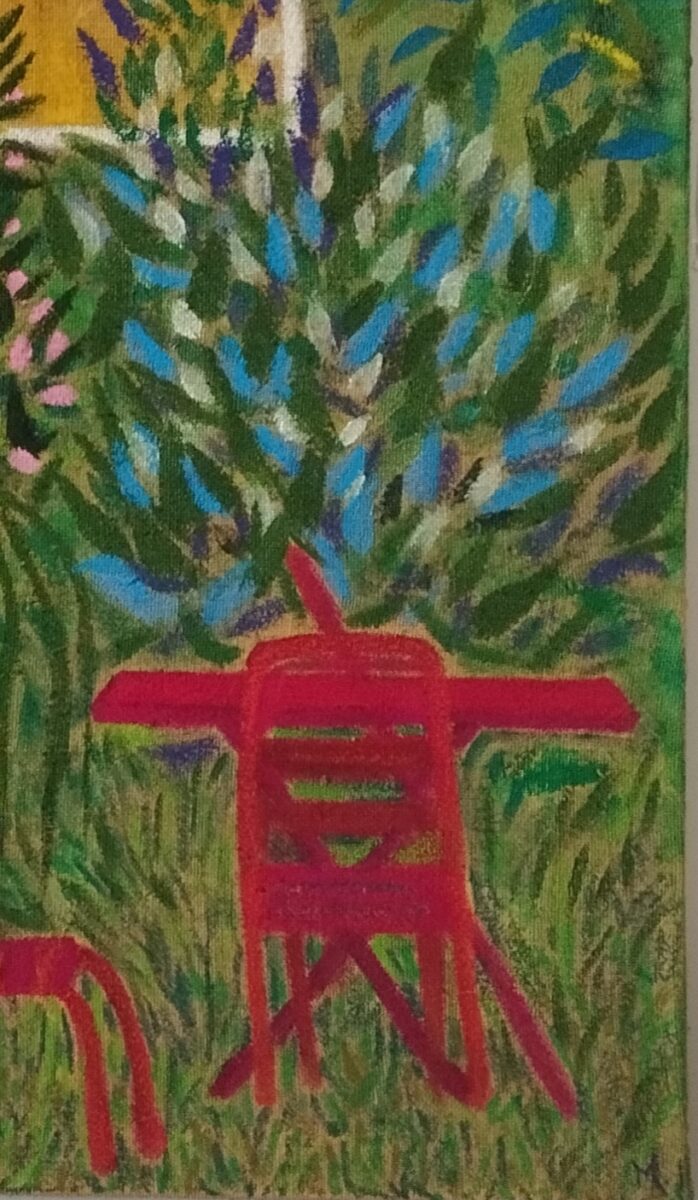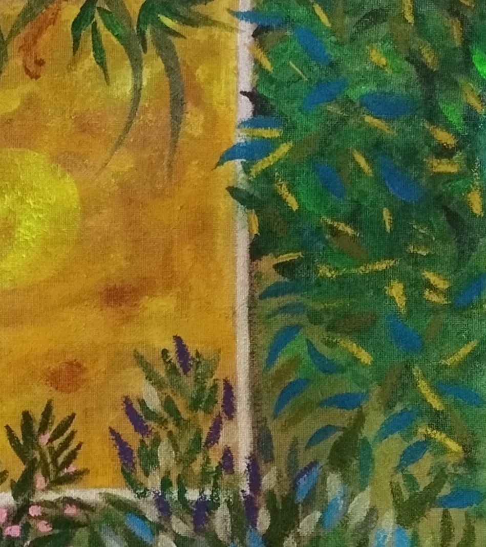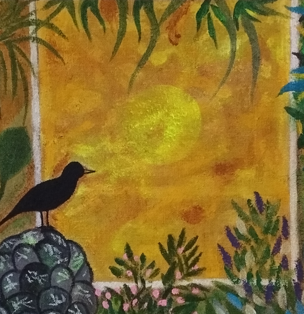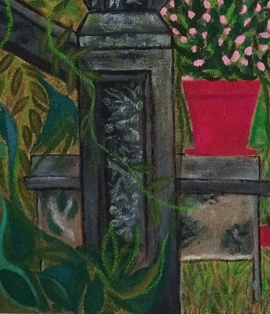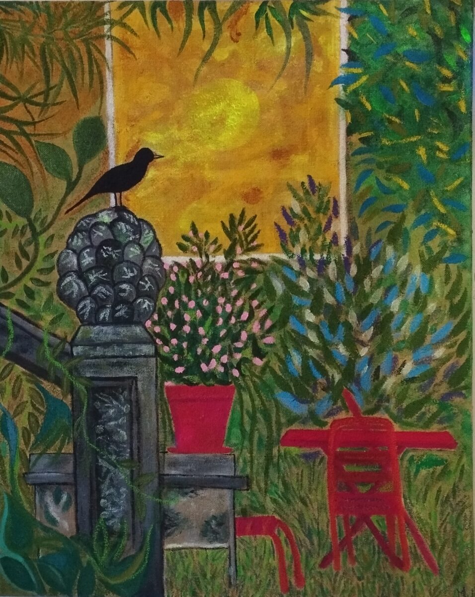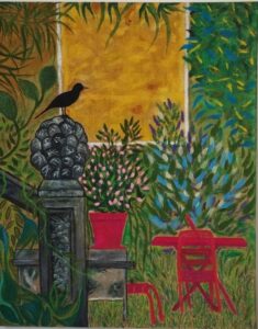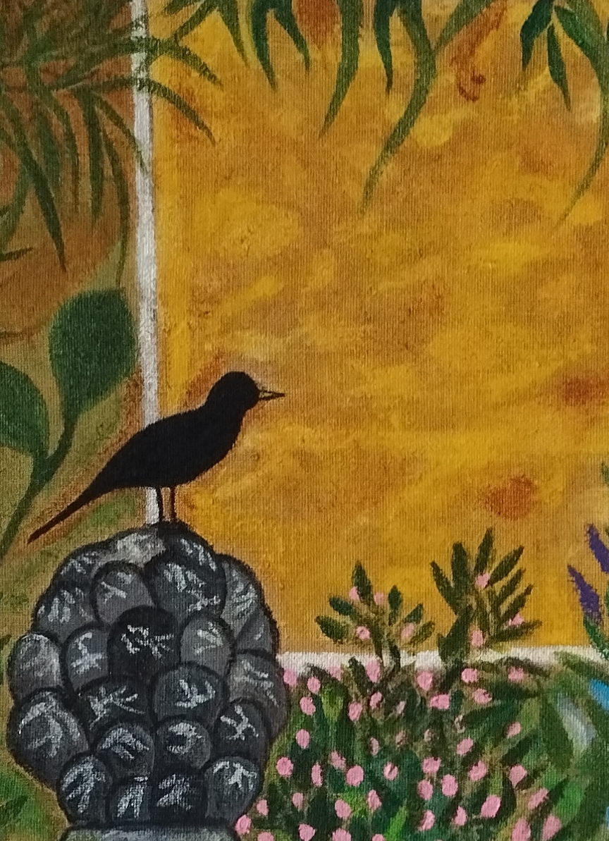 Un merle est posé sur un pilier de jardin en ciment. J’ai choisi d’ajouter de plus en plus de végétation au fur et à mesure que cette peinture avançait. Je ne voulais pas que ça ressemble à la photographie qui m’avait inspirée, mais laisser aller ma gestuelle et mon imaginaire :