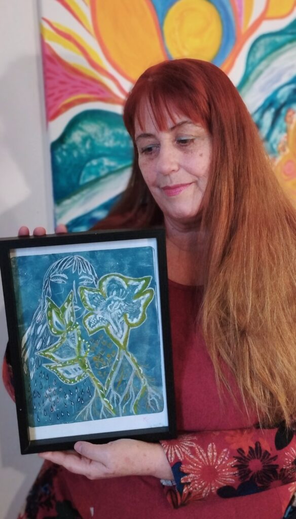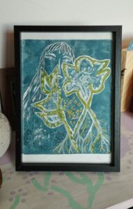 Fond préalablement travaillé à la peinture à l’huile bleue avec des impressions de végétaux.