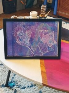 Le tout ensuite, travaillé à nouveau avec des pointes fines acryliques et des pastels gras.