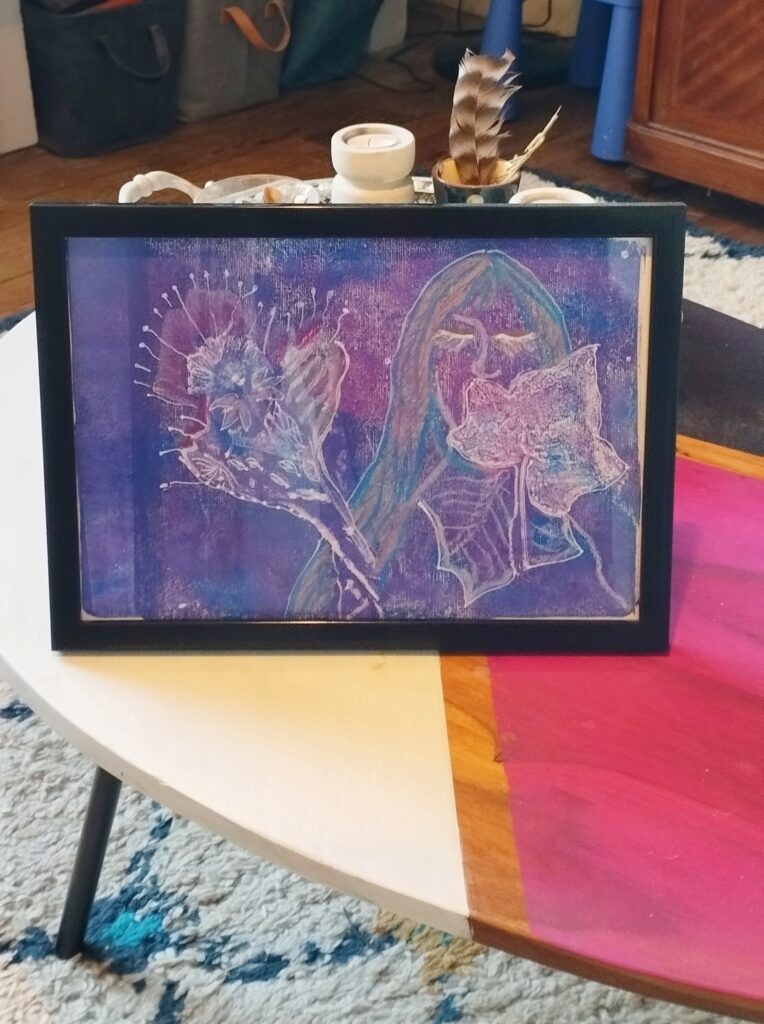 C’est certainement pour cela que le dessin de cette femme qui hume une feuille près de grandes fleurs est apparu sur cette peinture.