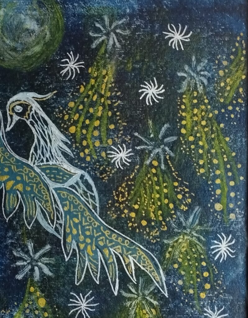 Ensuite le dessin s’est affiné avec des pointes fines acryliques blanches & dorées ainsi qu’avec le pastel jaune, pour laisser apparaitre un grand oiseau poétique nocturne, entouré d’étoiles filantes …